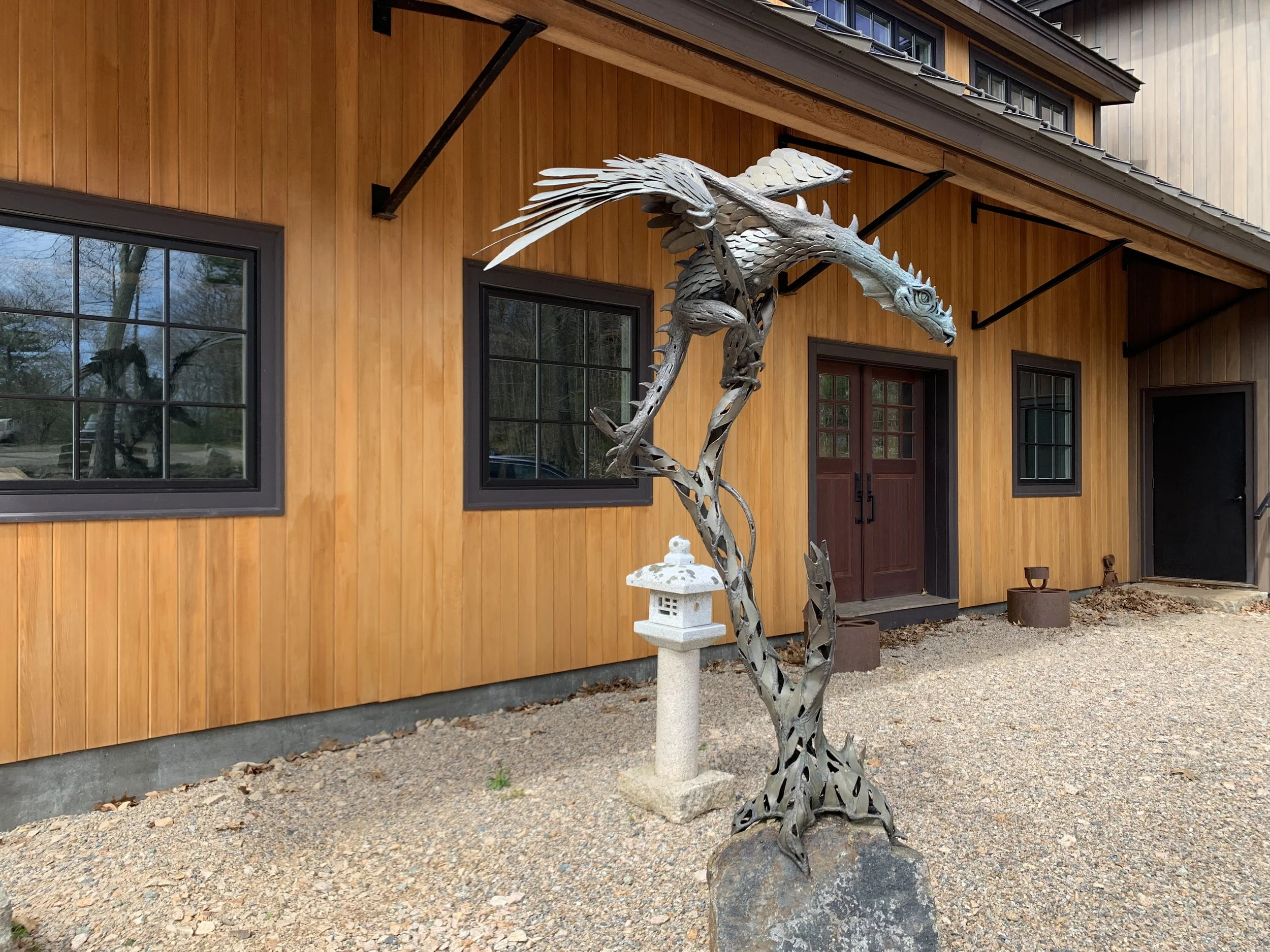 When creating this piece I envisioned him guarding a special garden or a sentinel at the entry of an estate. But I’m always excited to see the homes that my work is brought to. The vision of my clients gives me a new perspective. This piece would look great as part of a water pond feature. So many possibilities. If you have a home that needs protection, let this dragon stand guard for you.