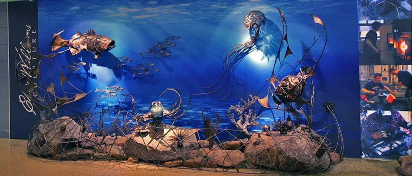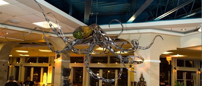 “Chris Williams' work has become the signature of Latitude 43. Jaws drop when people come in the front door and behold his highly animated 16 foot stainless steel and glass octopus suspended over the sushi pit. He is extraordinarily creative in solving practical problems with his art.”